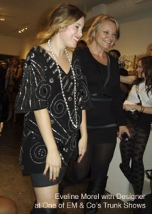 80s, she would take a business suit and make it stylish and fashionable. After learning the ins and outs of business, which involved learning how to run a business, working with creative people, putting events together, etc., she started making clothes for herself, and people started asking her where she got her clothes and could she make clothes for them. She decided to take those pieces to a store. They sold and she realized that she could design for a living. Eveline’s experience went from working in showrooms, to buying outfits, to working with designers. She realized that she needed to launch a collection.
