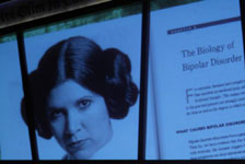 of waking up next to a friend who was no longer, literally dead in the night . . . and away we go on a ride equal to any of Hans Solo’s in the Millennium Falcon. Ms. Fischer, indelibly Princess Leia for those of us who experienced the Star Wars phenomenon, created and stars in her story of infamous parents, skyrocketing fame, and the hell of addiction. The show’s style might be described as delightfully engaging gallows humor presented in a tell-all fusion of Oprah, Jerry Springer, and psychotherapy gone very wrong. The low brow, celebrity confessional opening did have this reviewer cringing in anticipation of a very long night; however, Ms. Fisher’s self-effacing infectious humor, unbelievable story, and the adept direction of Tony Taccone soon had me laughing out loud . . . between gasps of disbelief. The show’s casual tone is wonderfully enhanced by the fact that our heroine greets us barefoot in her jammies on a set that is a charming living room amalgamation of Star Wars memorabilia. From a family tree photo chart guide (“Hollywood Inbreeding 101”) that ends with Ms. Fisher’s daughter dating Elizabeth Taylor’s grandson (the same Elizabeth Taylor for whom her father left her mother) to tumultuous on again off again with Paul Simon, the Star Wars saga, and the dark purgatory of addiction and mental illness. Carrie Fisher commits the ultimate celebrity confessional. Instead of being turned off by what could easily have played as self-absorbed sympathy seeking, we are wowed by her as she makes us feel like a friend chatting on the couch. Is Ms. Fisher a celebrity in need of attention? Of course she is, but she has such a welcoming, side splitting way of letting us into her train wreck of a life that we forget the narcissism and celebrate the survivor that Carrie Fisher has become.