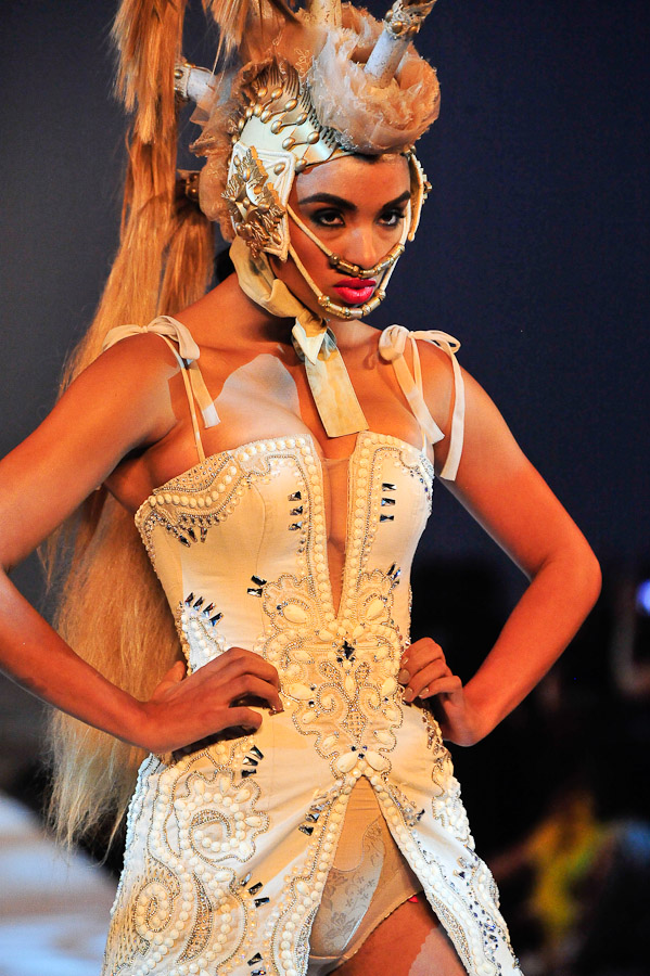 Furne One’s Spring 2012 collection is an ode to the Roman Empire, with “godlike” inspirations and ostentatious appliqués.  Headdresses fit for a Caesar, stiletto platform matching boots, upholstery tassels, and all the elements of haute couture, except for one thing.  Though thematically this collection was consistent in its palette, I for one did not appreciate the less than worthy stitching of these garments.  From a distance all looks divine; up close not so much.  If you’re going to call it haute couture, it deserves a superior blend of fabrics, finer craftsmanship, and more attention to detail, none of which Furne One had—thus my earlier observation, “self-proclaimed artisan.”  That’s when haute couture becomes ouch couture!  Consistency and accuracy of a collection’s description are paramount when branding a line.  Calling something haute couture means it should be of the highest caliber in every aspect of design if people are expected to pay that insane price tag that accompanies one of these garments.  Furne One does deserve some credit for his efforts, but I think he should raise his standards (or lower his prices) to match the level of the Gaultiers and McQueens of our time.  Otherwise, he’s just a mere costumer.