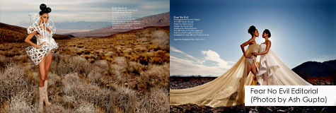The line has showcased on the runways of Dubai, London, and America.  But as I sat up close while the parade of D-list models trotted down my catwalk, I took pause.  Later, as I went through Arun Nevader’s backstage and runway images of the show and Ash Gupta’s breathtaking slant on this issue’s featured editorial, “Fear No Evil,” featuring Furne One, it dawned on me where this collection’s showing went wrong.  It was all about the presentation or lack thereof.