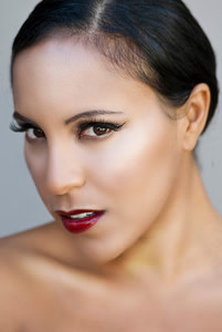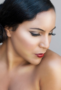 Despite their twin status, Shayla and Ninah have different shaped faces and slightly different features. Shayla has more of a “sweetheart” structure to her face, with a high forehead, high cheekbones, and strong jaw line. Ninah’s face has more of an oval shape, with smaller eyes and a narrow bridge. Despite these differences, both makeup looks are interchangeable. Either woman can wear the other’s look. The simple change of eye and lip color translates effortlessly on all features and basic face shapes.