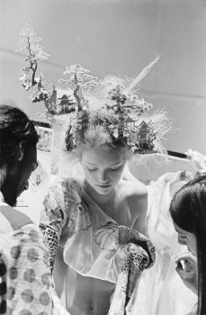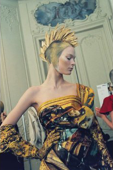 It did not end for Deniau when it seemed over in February of 2010—she had a photographic record of 13 years—her years of “backstages,” many of them with intimate candid shots of the designer at work. We’ve had all our McQueen runway dreams one at a time for years, but Deniau has given us his dream saga across time in a single volume of mostly stunning black and white film images, color here and there with less success, especially in skin tone and makeup. The power of each photograph is linked to many others, and not always by the quality of photographic technique. She has plenty of photographic technique, shooting primarily to see what is and is not there—the real payoff in backstage photography. Granted, it’s hard to miss with a subject like hers. But there’s a Proustian, hypnotic pleasure in the meticulous flow of one photograph into the next. She creates her intensely personal “remembrance of things past” in arranging 400 images. Deniau’s book feels like a still photo documentary, a meditation on a designer’s signature art through the art of her own image making.