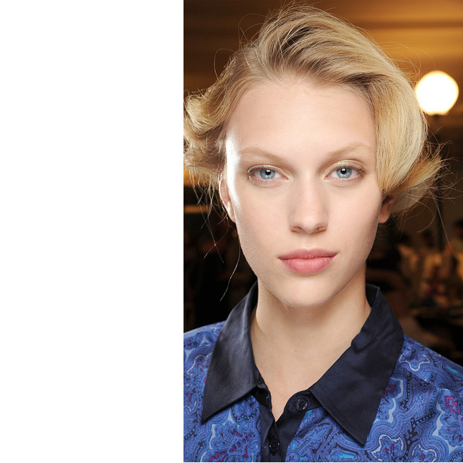 Emilio Pucci went for a little more definition, with a strong winged liner and pinky-nude eye shadows and lip colors. The skin was kept clean and luminous, with no added color to the cheeks for effect. Artists used a combination of MAC products, including Mineralize Skin Finish and false lashes to complete the look.